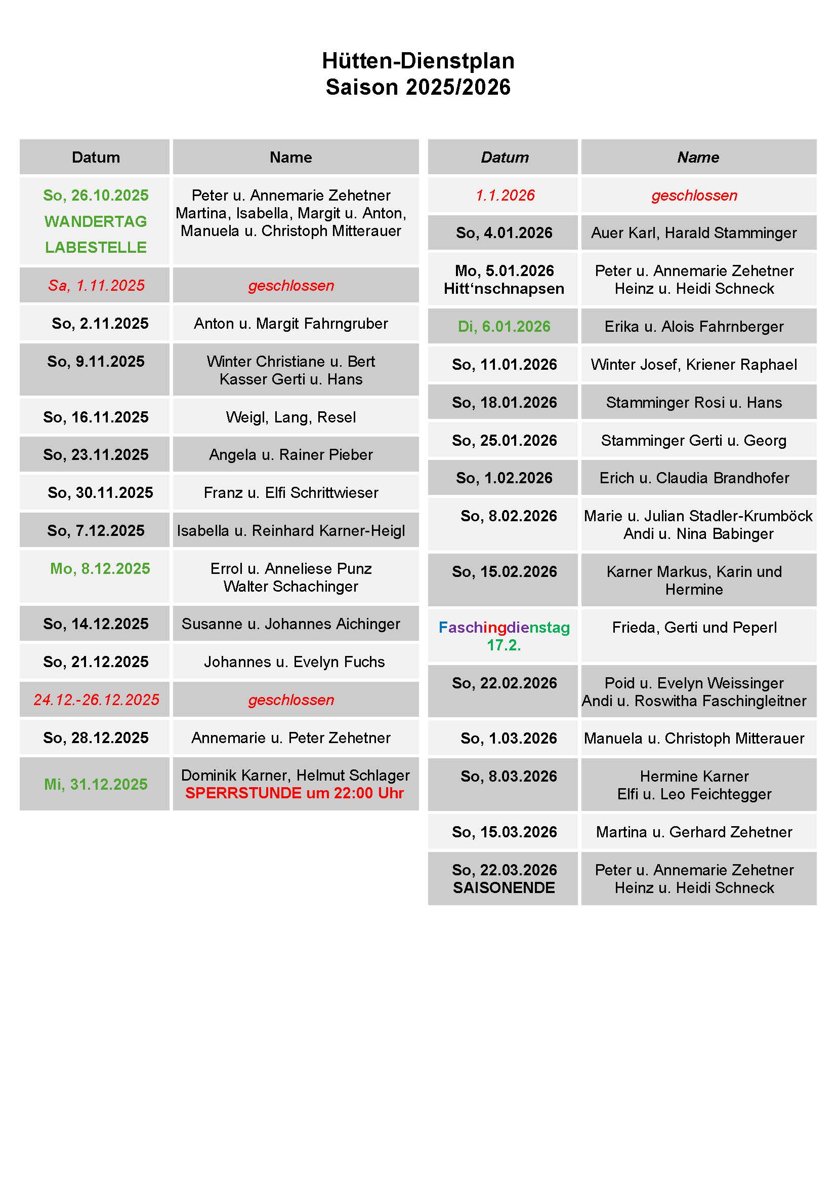♦ Hier bekommt ihr den aktuellen Hütten-Dienstplan.